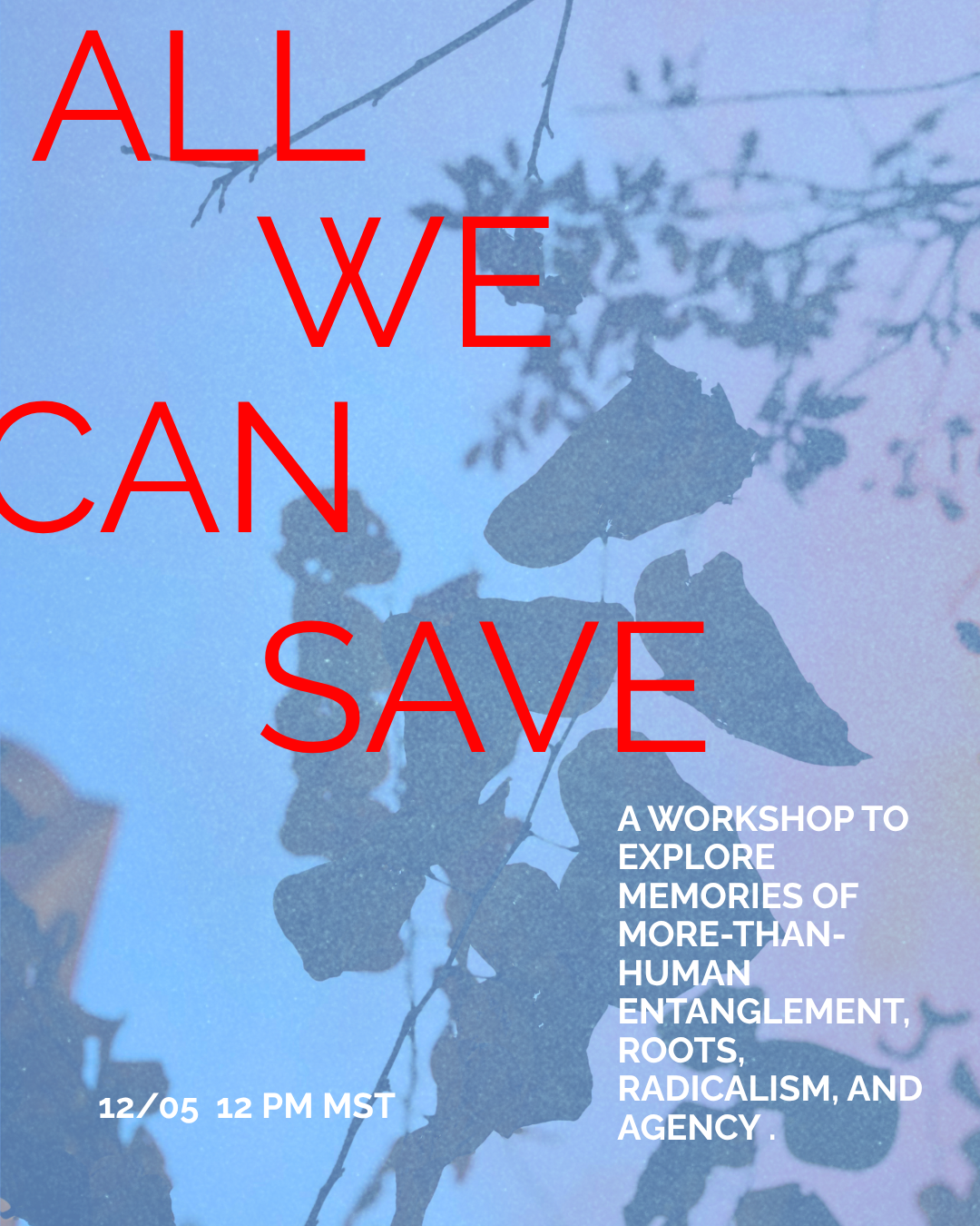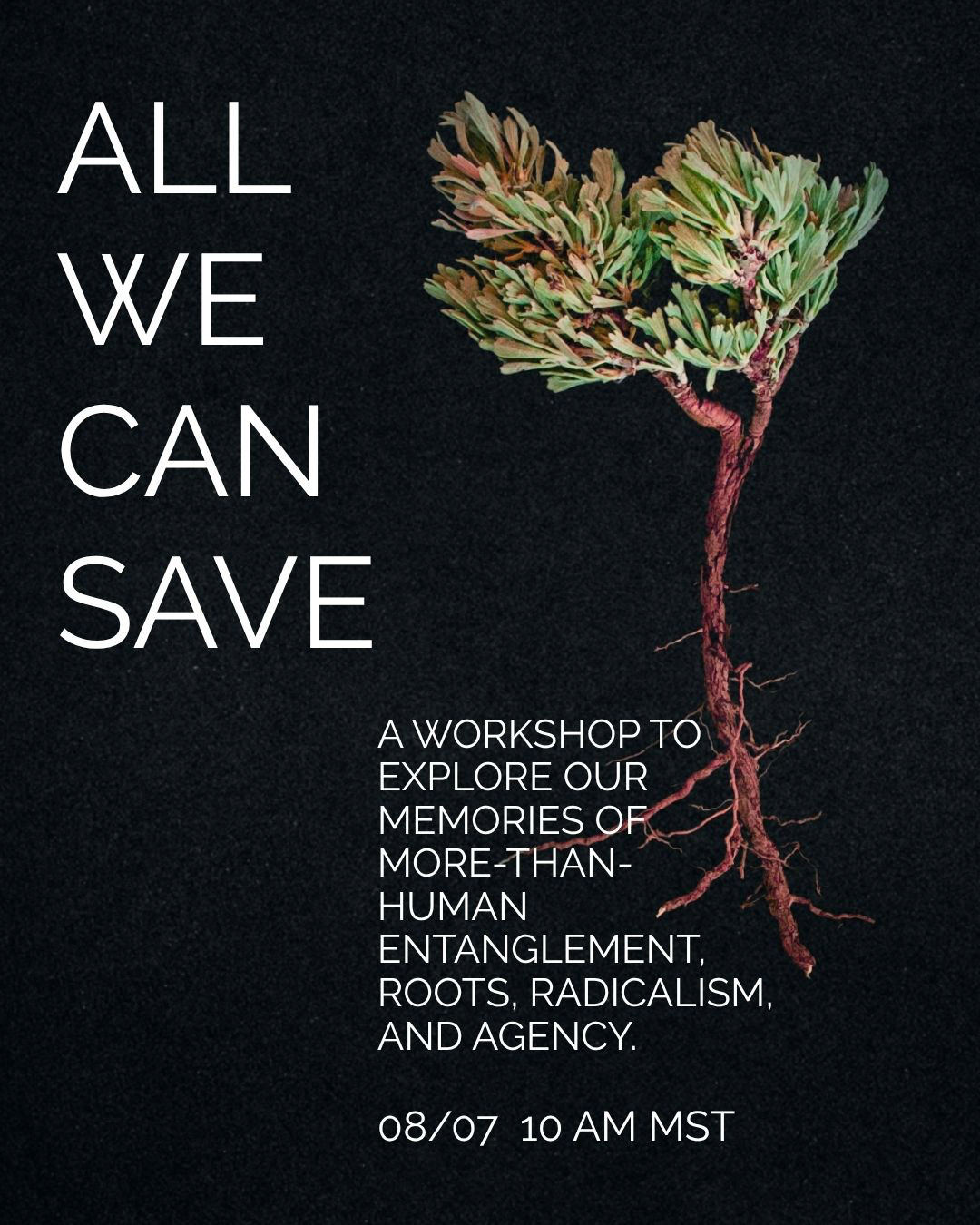Lead by interdisciplinary artist and environmental scientist Willow Gatewood, this discussion-based workshop seeks to explore our memories of more-than-human entanglement, roots, radicalism, and agency through reframing the question, what have we lost? to what can we save?