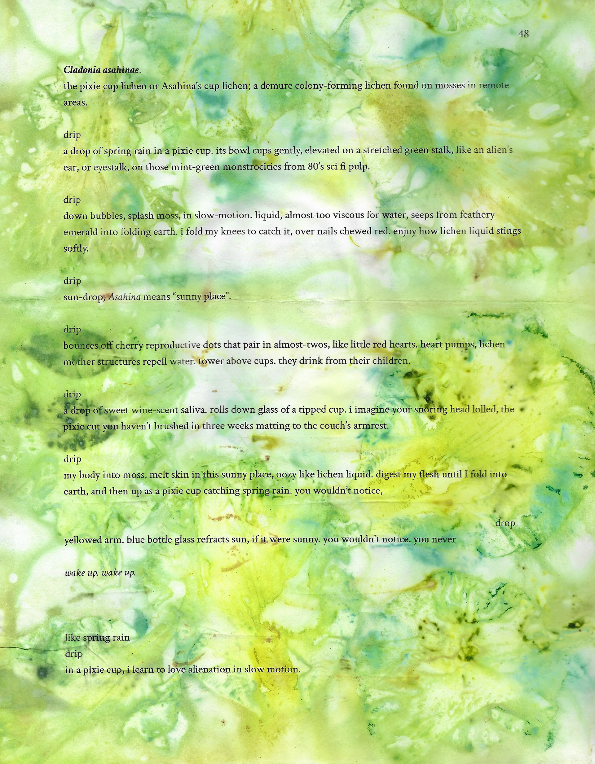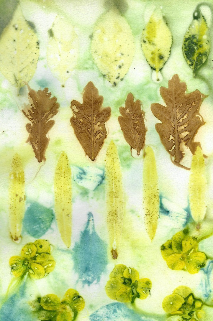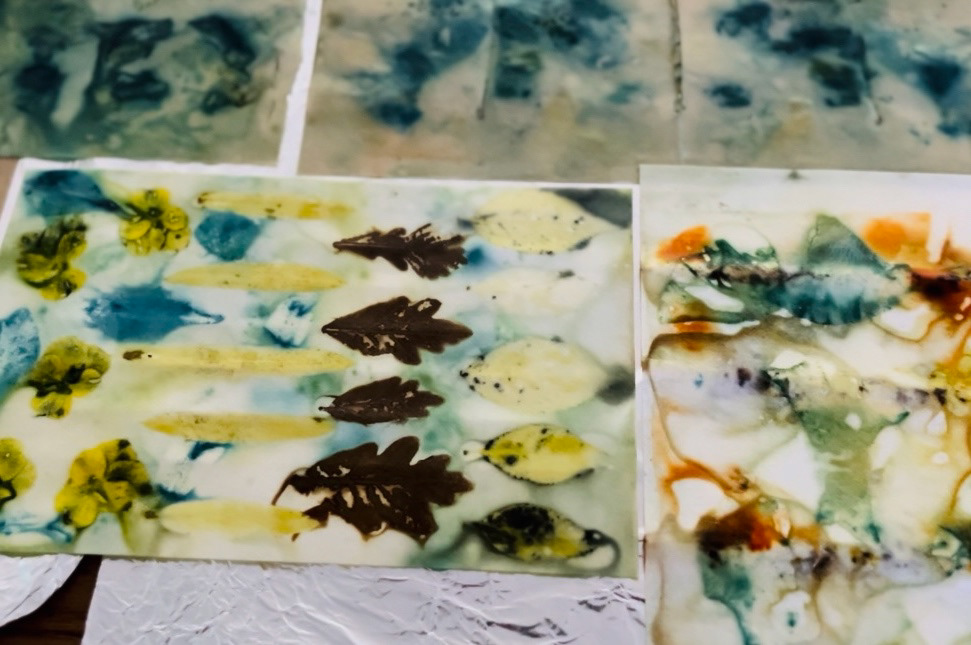 This workshop immerses students in the world of environmental and bio-based art. First, students learn an alternative printmaking practice called eco-printing, a technique used to "print" botanical designs and colors onto paper with leaves, flowers, lichens, and other natural dye materials. We use these designs alongside poetry, text, and print to make final pieces.
